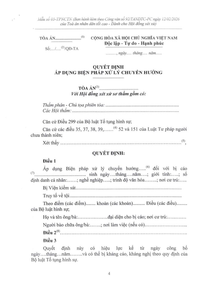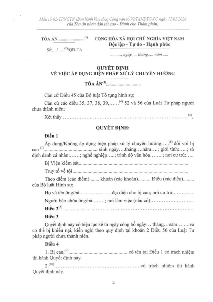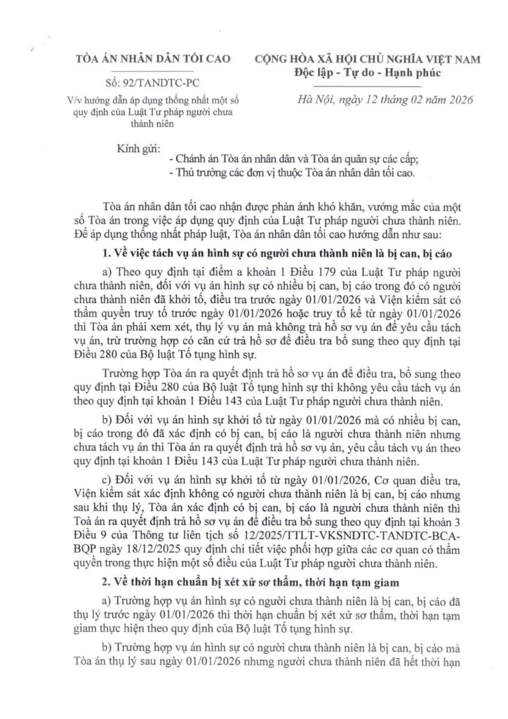Ngày 12/02/2026 Tòa án nhân dân tối cao ban hành Công văn số 92/TANDTC-PC về việc hướng dẫn áp dụng thống nhất một số quy định của Luật Tư pháp người chưa thành niên.