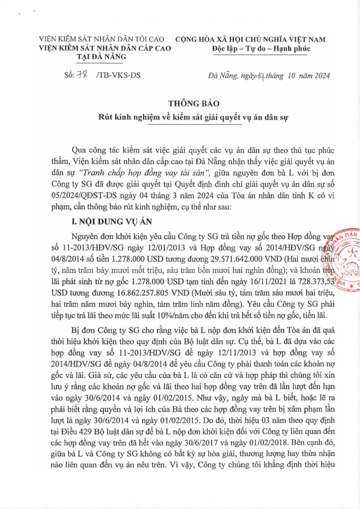 Ngày 14 tháng 10 năm 2024, Viện kiểm sát nhân dân cấp cao tại Đà Nẵng ban hành Thông báo số 78/TB-VKS-DS rút kinh nghiệm về kiểm sát việc giải quyết vụ án dân sự.