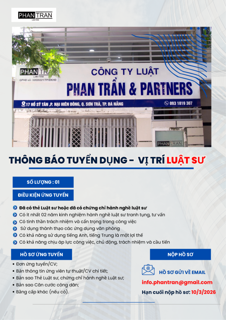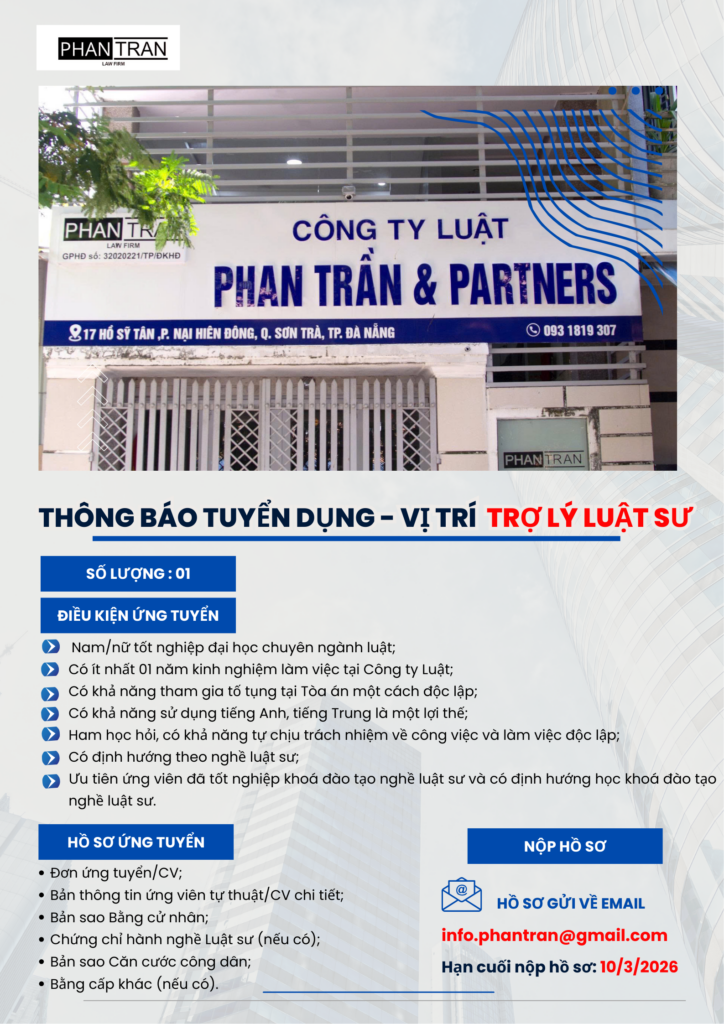 • Địa điểm làm việc: Văn phòng Công ty Luật TNHH Phan Trần & Partners, 17 Hồ Sĩ Tân, phường Sơn Trà, thành phố Đà Nẵng.