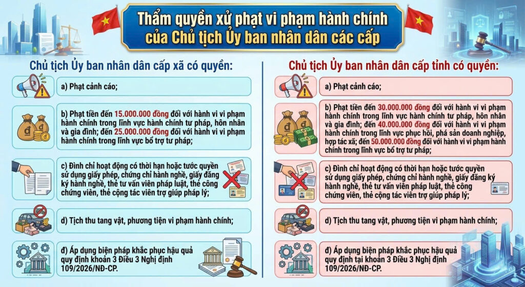 Theo quy định tại Điều 84 của Nghị định này, Chủ tịch UBND cấp xã đã được trao thêm quyền áp dụng một số hình thức xử phạt bổ sung, trong đó bao gồm cả việc tước quyền sử dụng chứng chỉ hành nghề luật sư trong những trường hợp nhất định theo quy định tại Điều 8 Nghị định 109/2026/NĐ-CP. Cụ thể như sau: